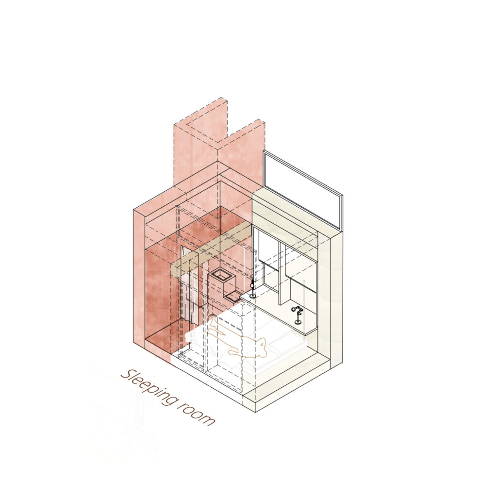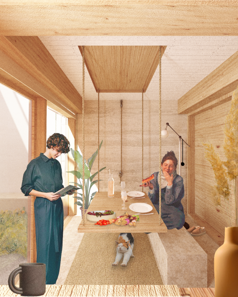 The project takes life through its modularity. The perception and uses of the spaces are transformed by elements coming up and down – the table, the bed, the basket going to the roof gardens – with the help of several pulley systems.