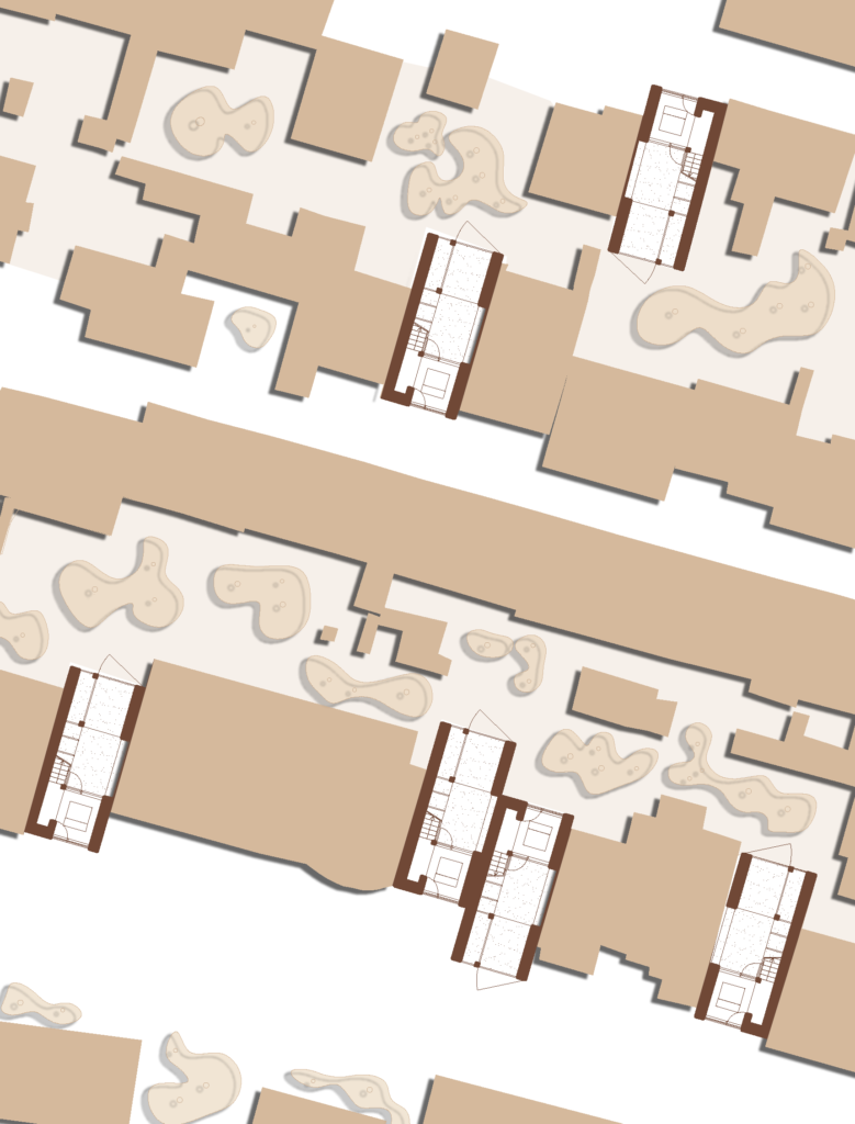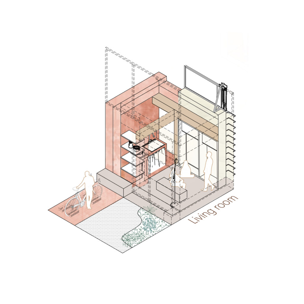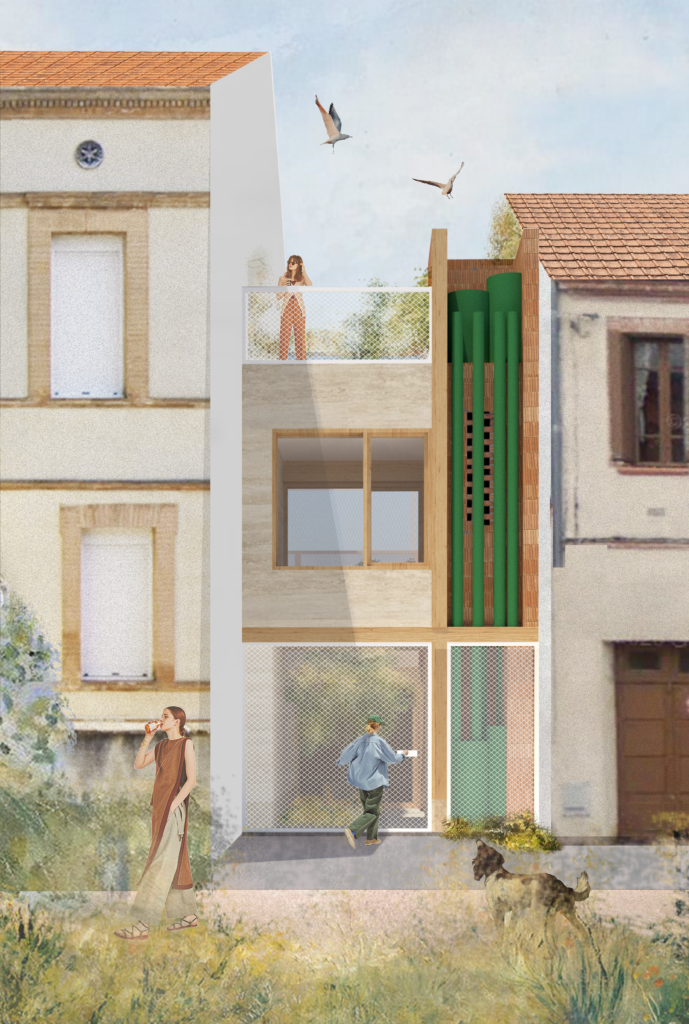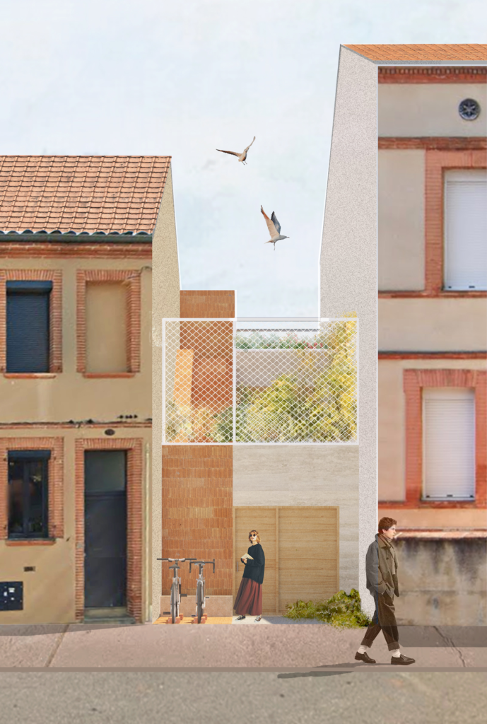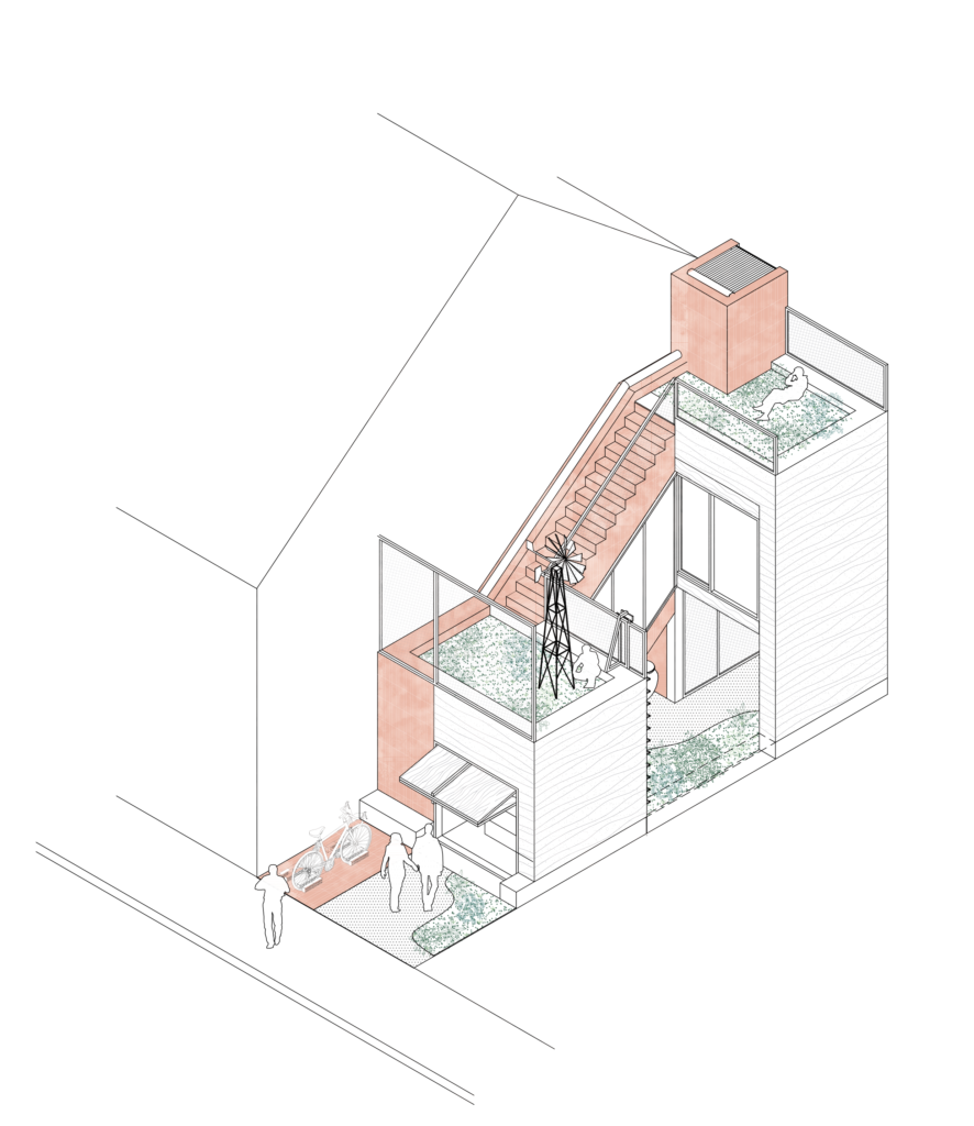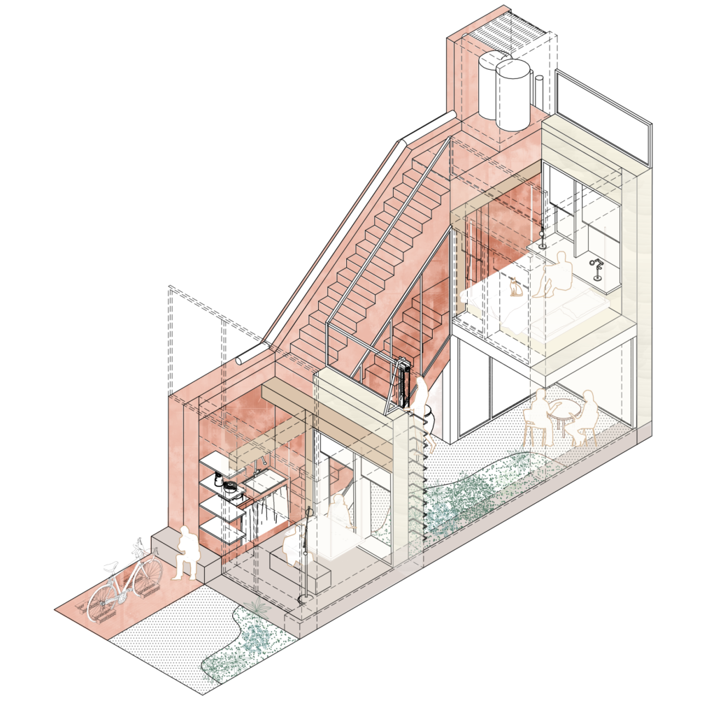 The project is designed to fill the gaps in existing city streets, finding solutions for urban densification within an existing framework and limiting urban sprawling. It encourages to think the city on, through and around the existing urban fabric, living off-grid in a city grid. The design allows the front garden to become an active threshold. It becomes part of the street and offers the possibility of opening the home to the neighbourhood in the summer days, without compromising the intimacy of its inhabitants.