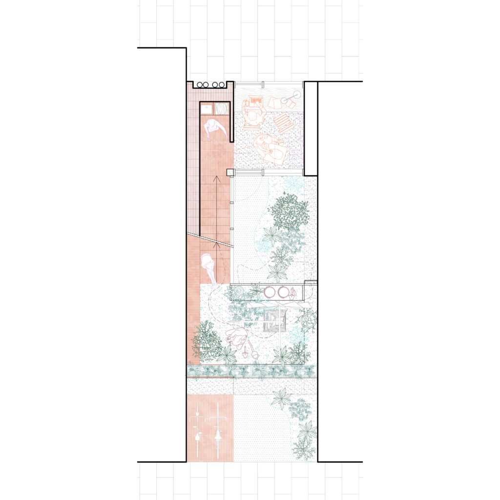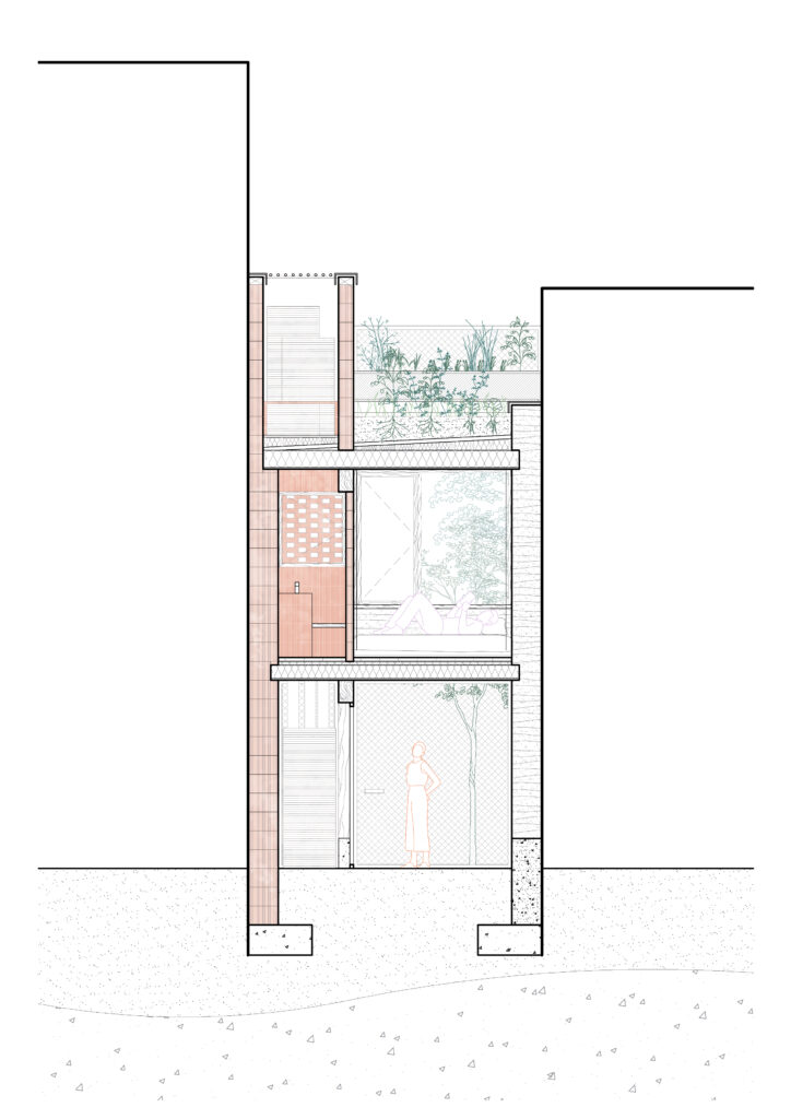 The project respects the gaps that it inhabits and its preexisting ecosystem, welcoming insects, birds and other small animals that need refuge in cities and making sure most of the footprint of the house is covered by planted surfaces.