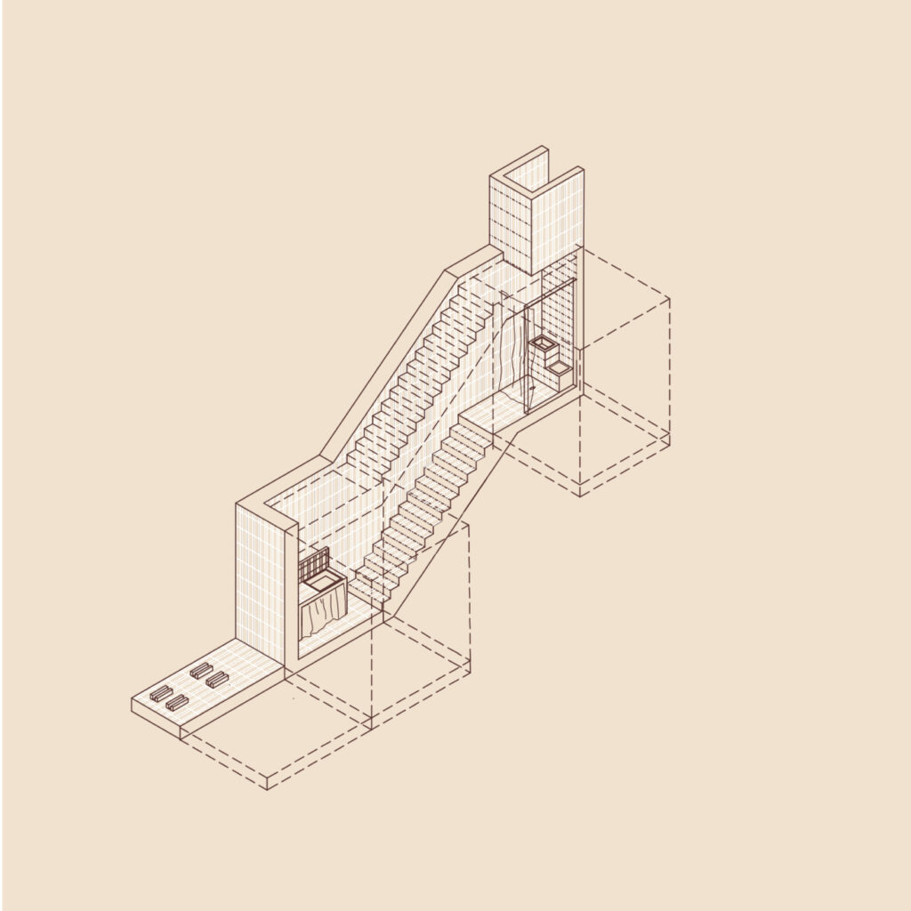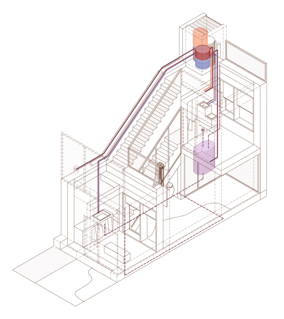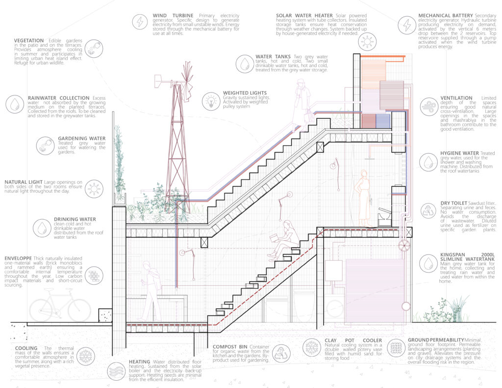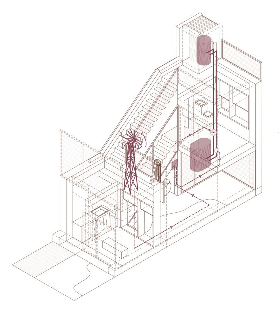 Frugality was a key concept throughout the conception of the project. The design ensures the comfort of its inhabitants while limiting energy needs as much as possible. The storage and distribution of electricity and water relies on gravity and it becomes integral to the architecture itself, allowing elements that are usually hidden to become part of the aesthetic of the design.