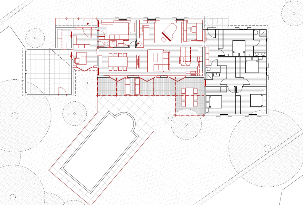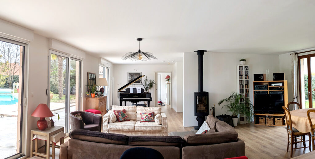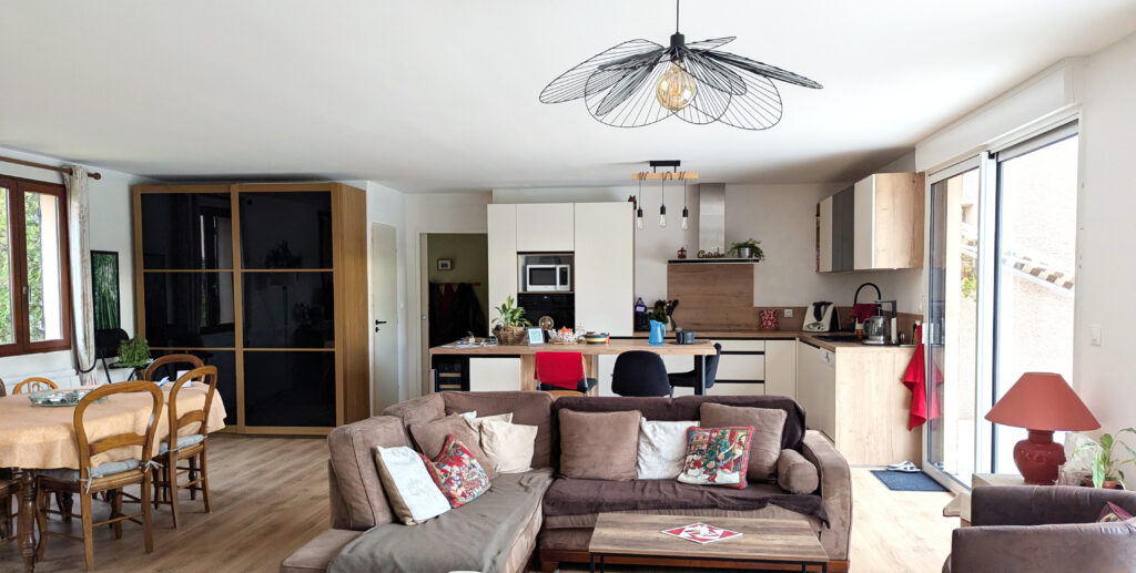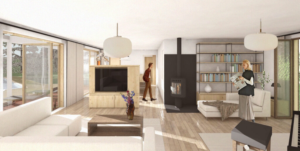 The clients wanted to transition to a more open-plan type of living and maximise the presence of light and sun in the living spaces.The driving idea of the project is to open the kitchen to the living spaces. The outdated chimney is moved and replaced by a wood stove to maximise heat production and free the angle of the kitchen. The office is moved to a smaller more enclosed space while all the other spaces open up between themselves and to the outside. The new organisation of the spaces ensures a seamless use for everyday life and for when visitors come over.
