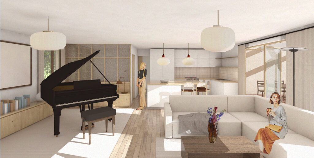 One of the clients is a piano teacher and wanted to keep her teaching room well separated from the rest of the house. The new entrance allows to form a lobby in the house with a direct access to the teaching room and the upright piano reserved for the students, creating an organic separation between public and private while also finding a direct access to the garage from the inside of the house.